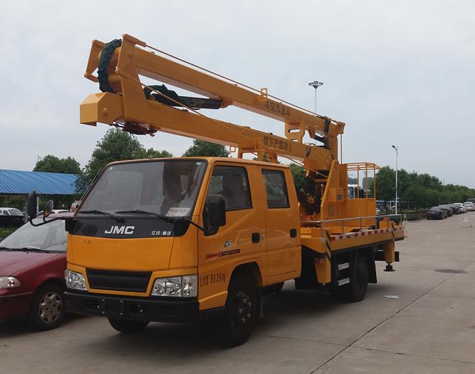 江鈴(新款)雙排工程黃駕駛室,軸距3360mm,江鈴115馬力國五發(fā)動機,油剎,五檔變速箱,7.00R16鋼絲胎,帶ABS.加裝空調(diào)。作業(yè)高度14米,液壓360度全回轉(zhuǎn),三節(jié)折疊臂,1噸可伸縮式吊鉤。